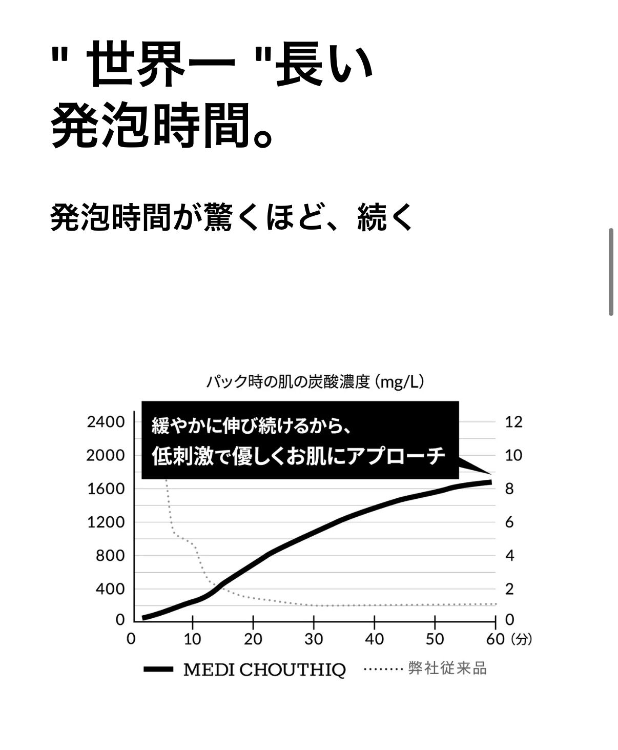 医療現場で生まれた高濃度炭酸で本格ケアをして頂ける、炭酸フェイスパックです。特許取得済み技術により、世界一炭酸の発泡時間が持続します。緩やかに持続する炭酸で、肌を刺激することなく、炭酸ガスを筋繊維の奥まで届けます。